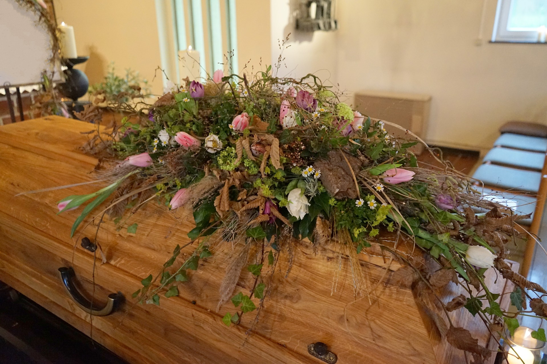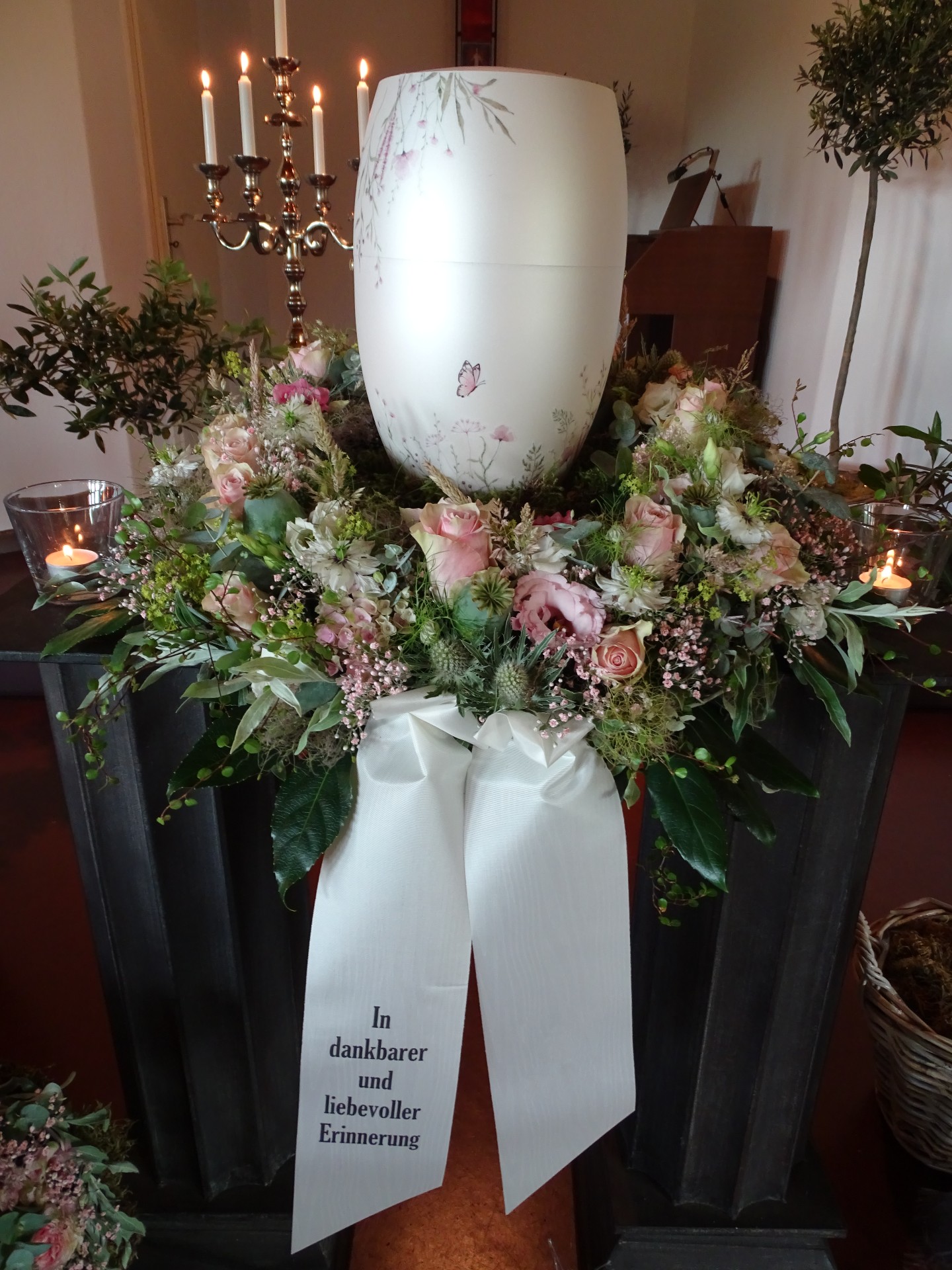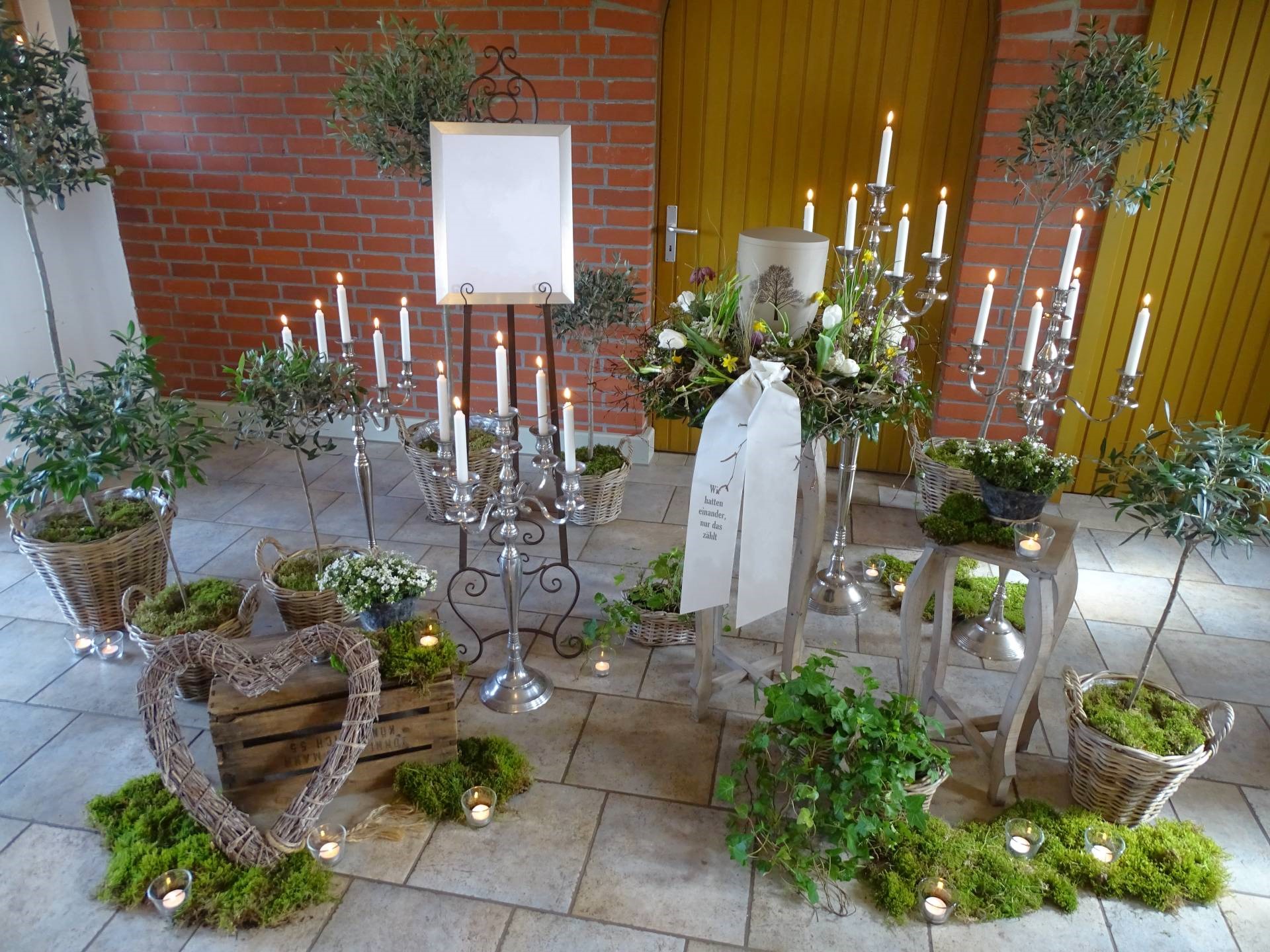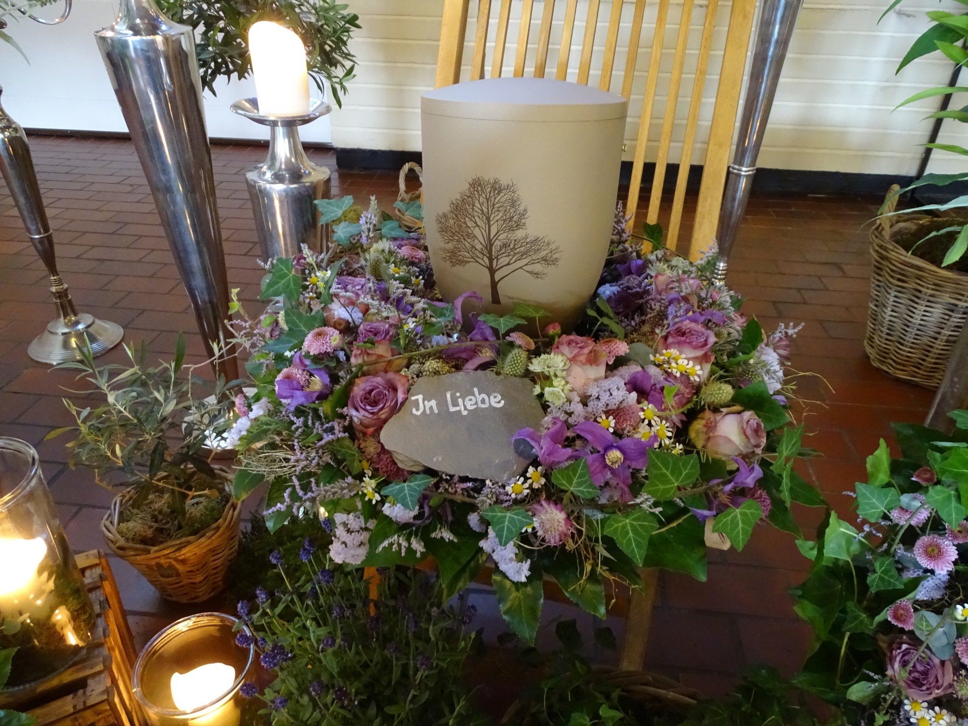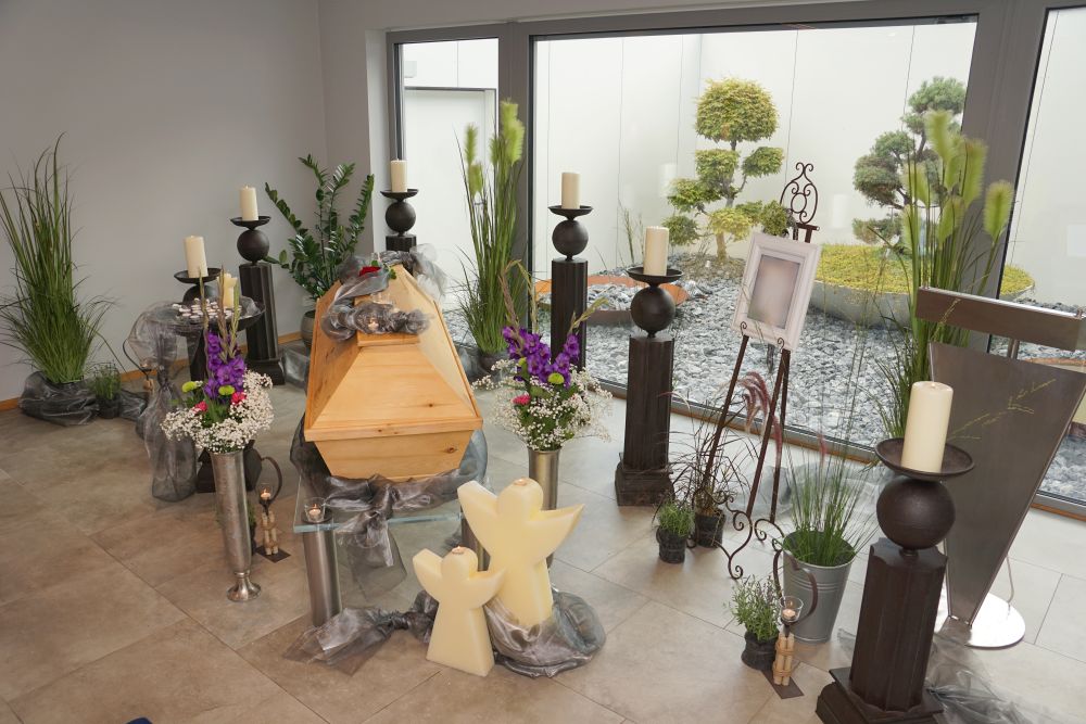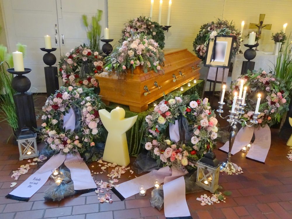 Wir sind mit viel Engagement und Kreativität für Sie da. Immer wieder hören wir, dass unsere Arrangements eine schöne Atmosphäre und wertvolle Erinnerungen schaffen. Das gelingt uns beispielsweise mit Accessoires aus dem Berufsleben oder Dekorationen, die Bezug auf das geliebte Hobby nehmen. Wenn Sie es wünschen, unterstützen wir Sie: mit besonderen Dekorationen, stimmungsvoller Musik oder individuellen Abschiedsritualen.