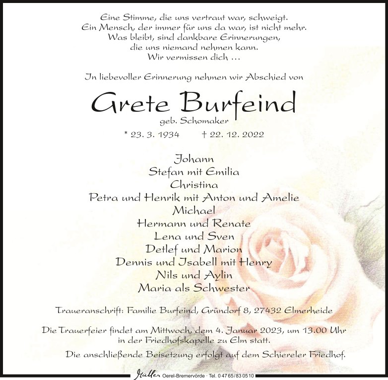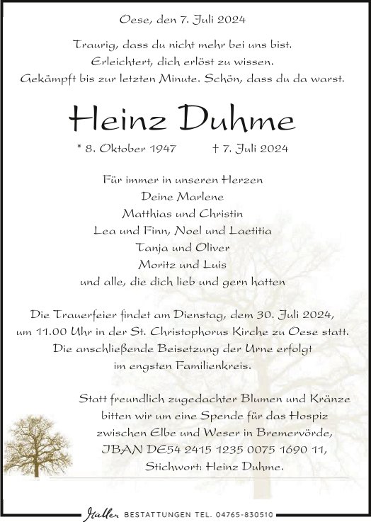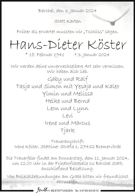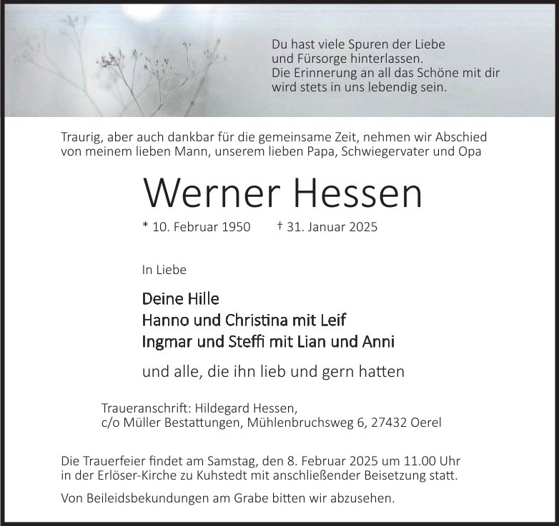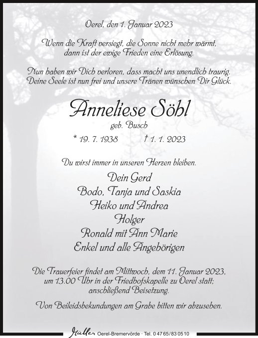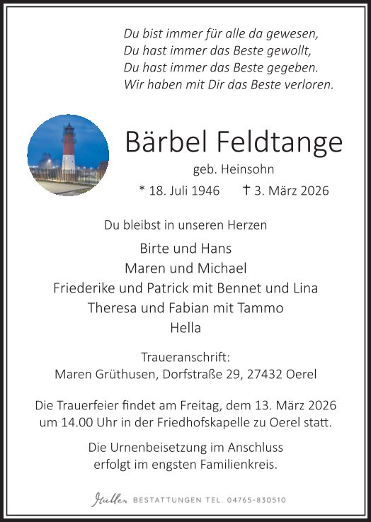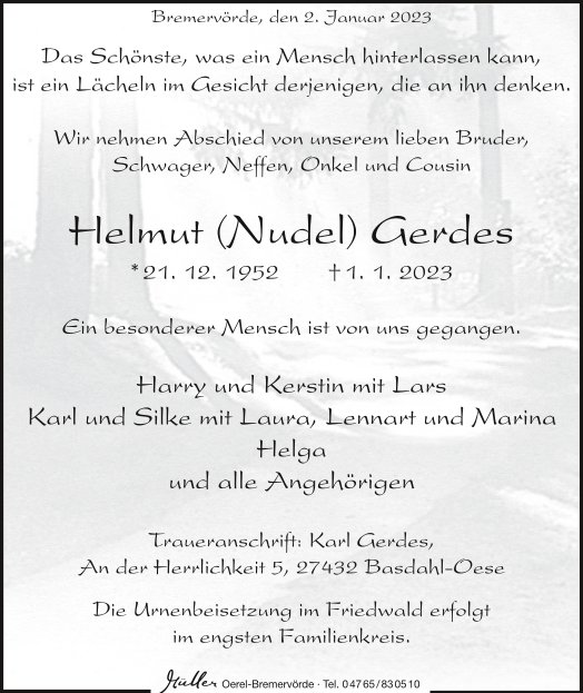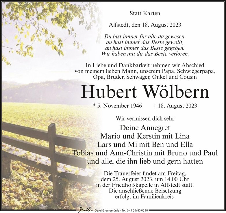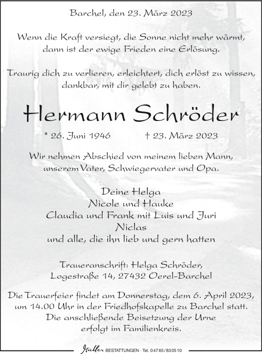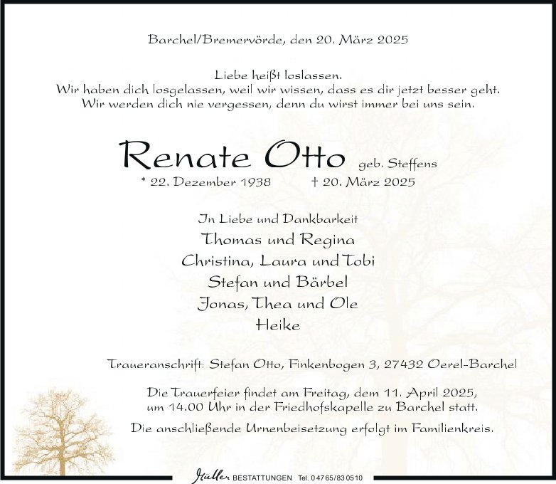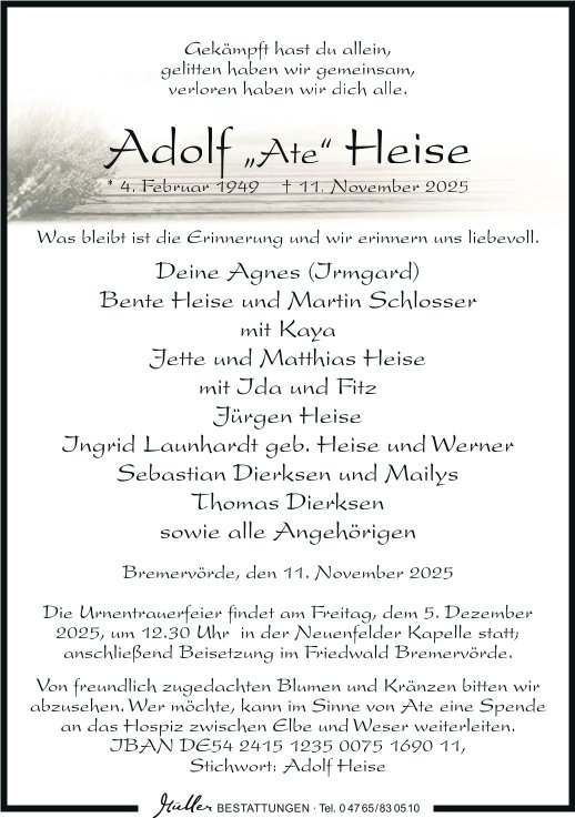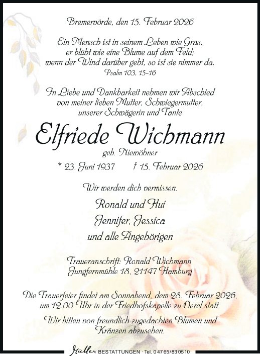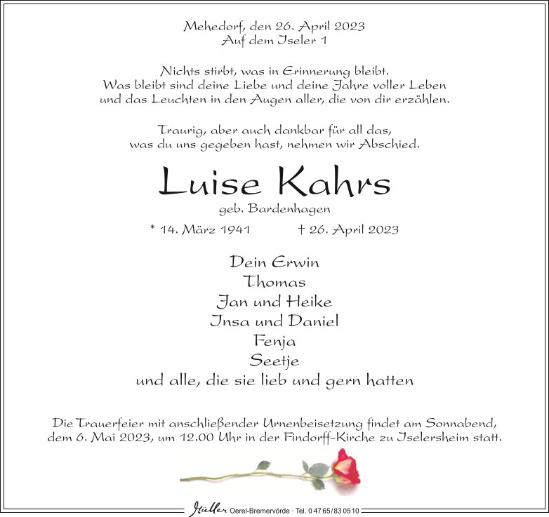 Die Trauerfeier findet am 5. November 2022 um 11.00 Uhr in der Findorff-Kirche zu Iselersheim statt.