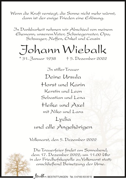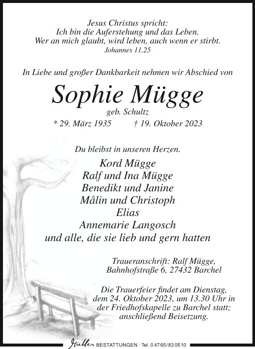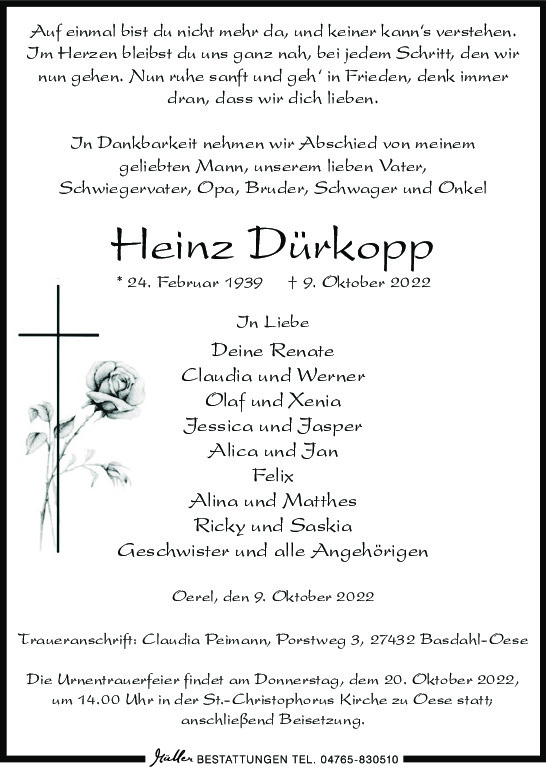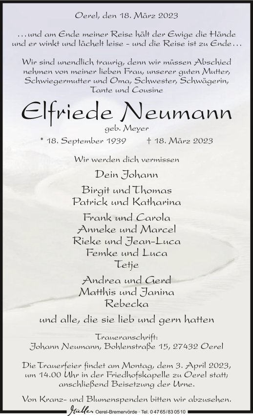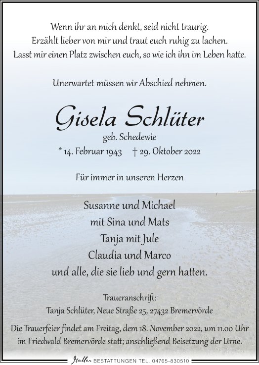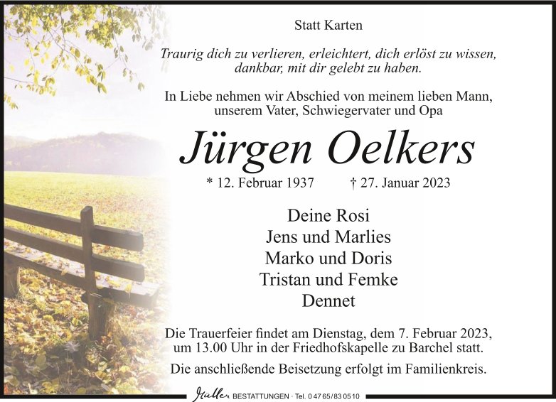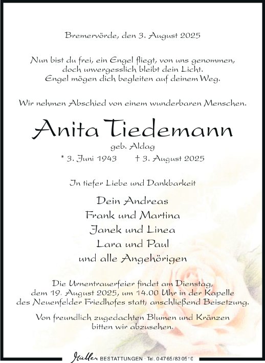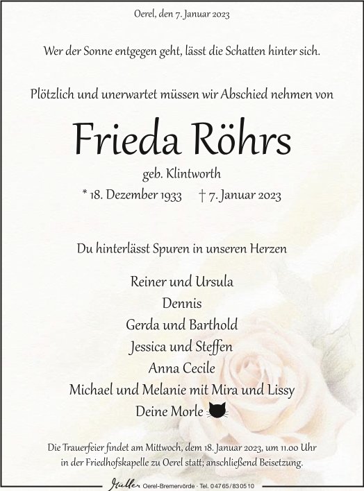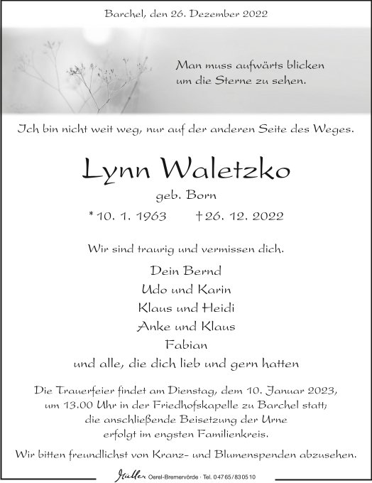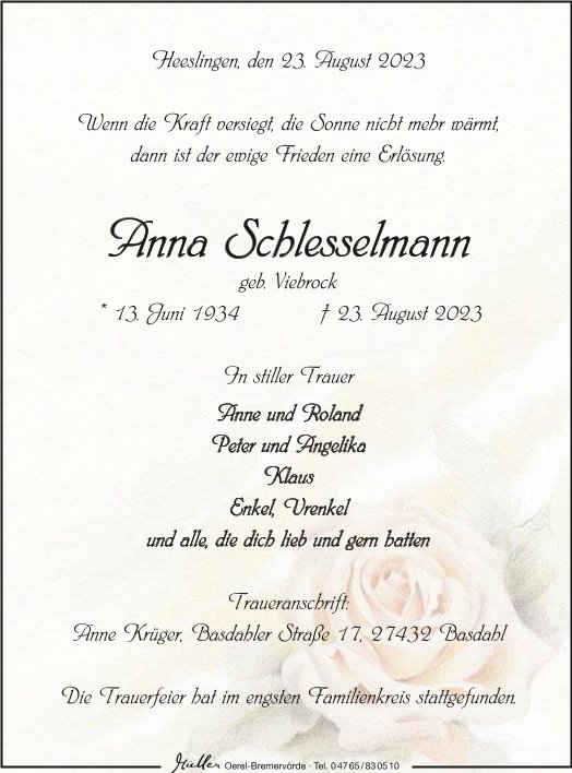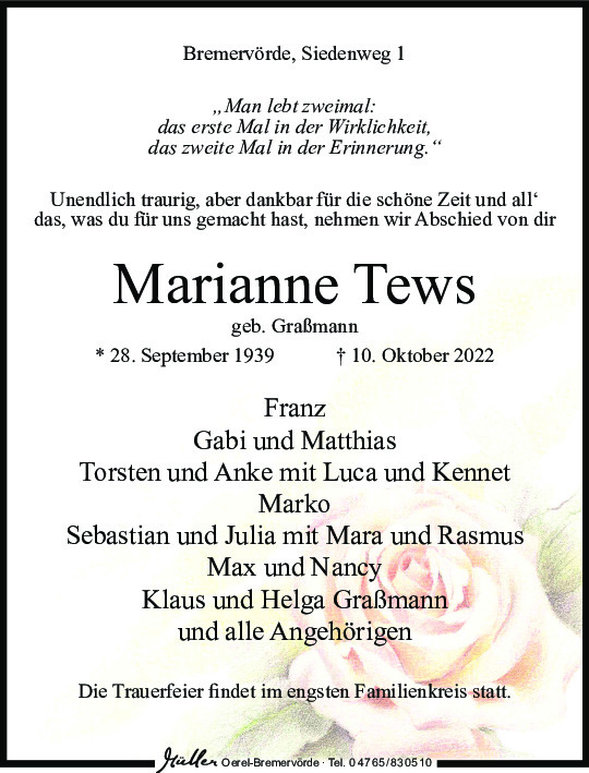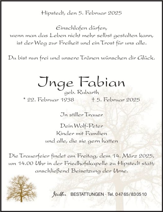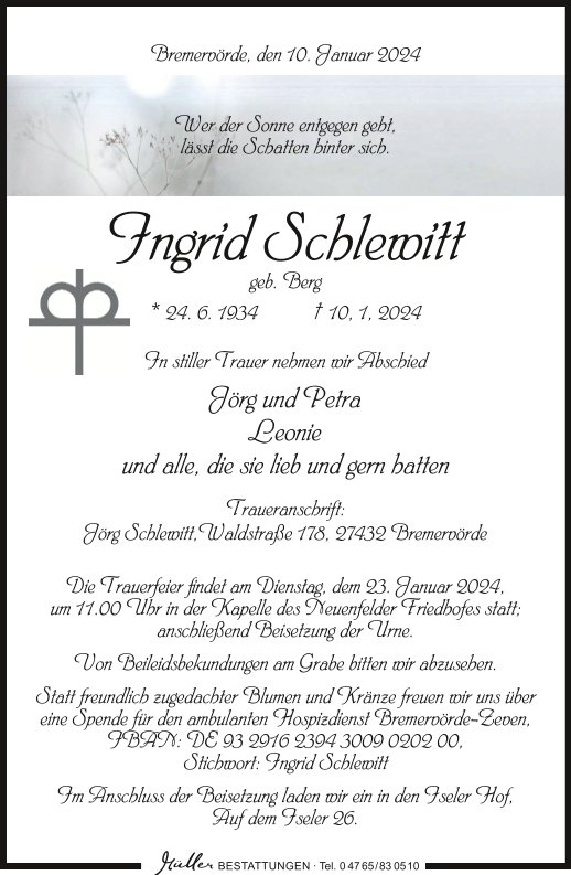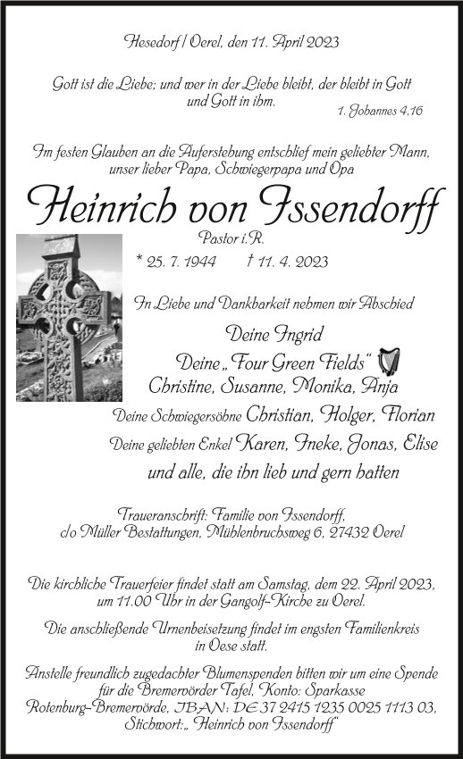 Die Trauerfeier findet am 5. November 2022 um 11.00 Uhr in der Findorff-Kirche zu Iselersheim statt.
