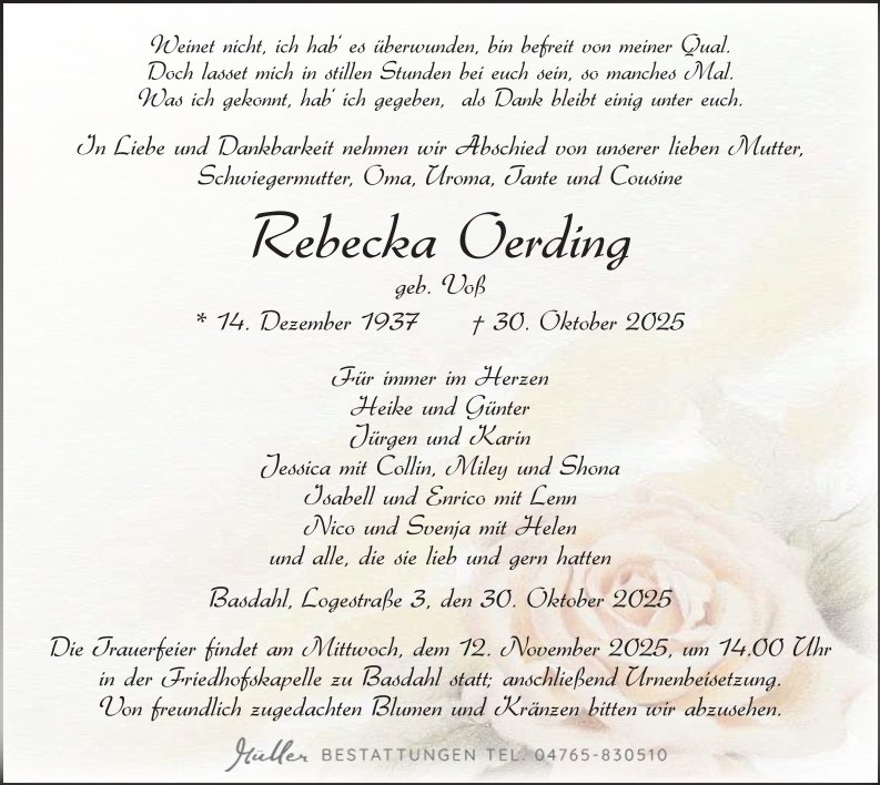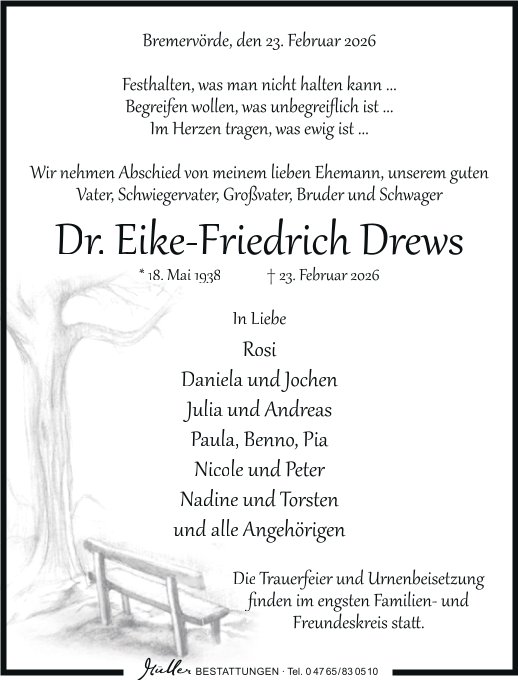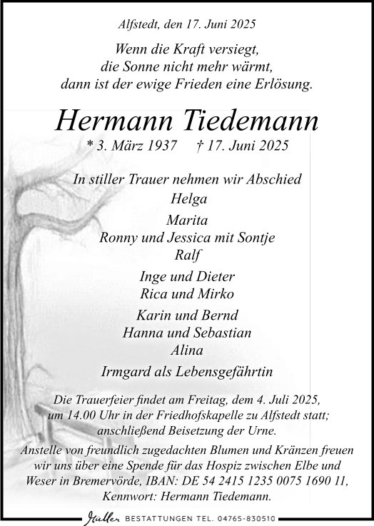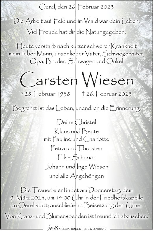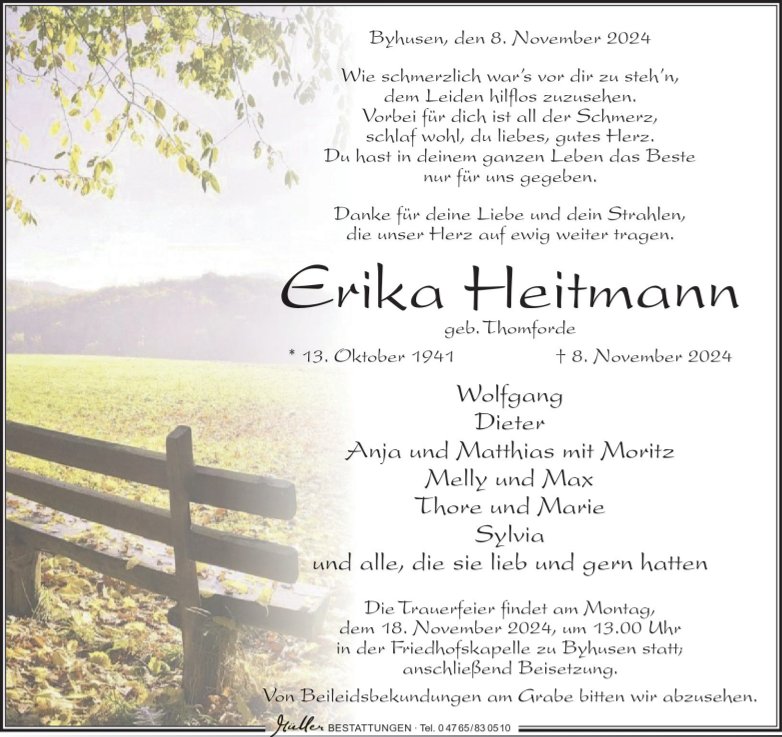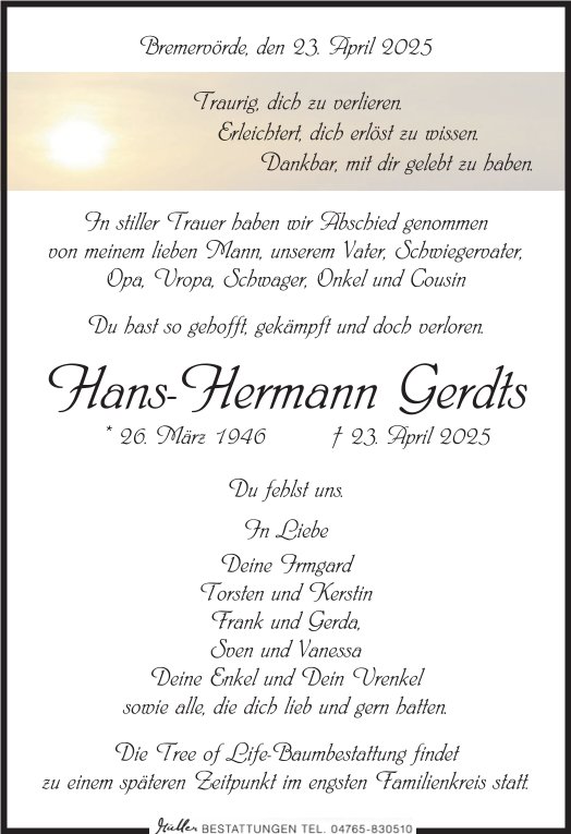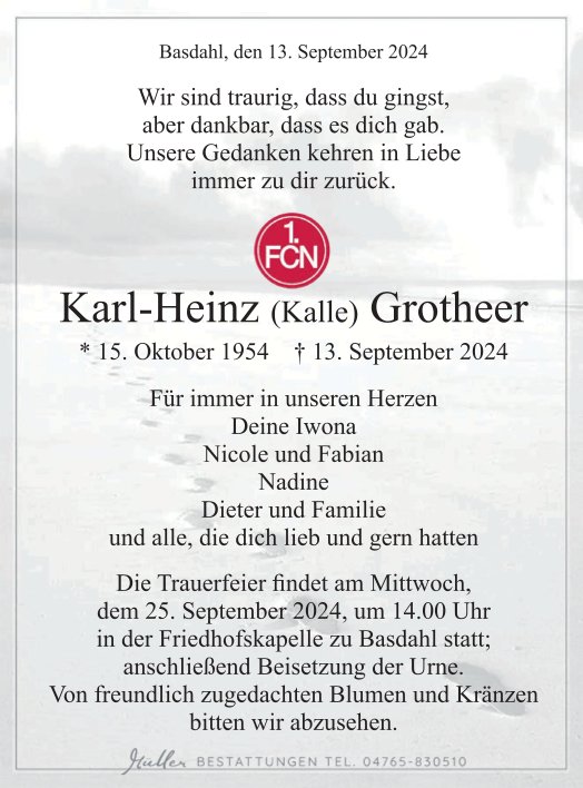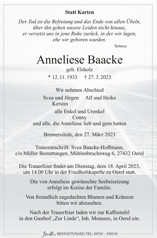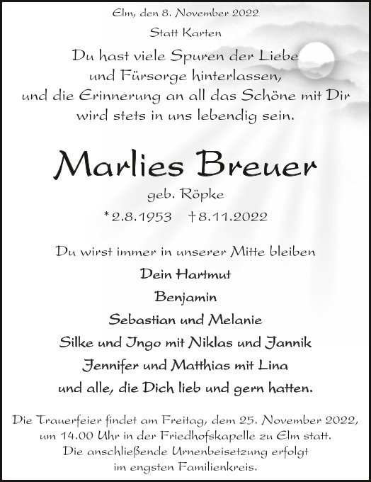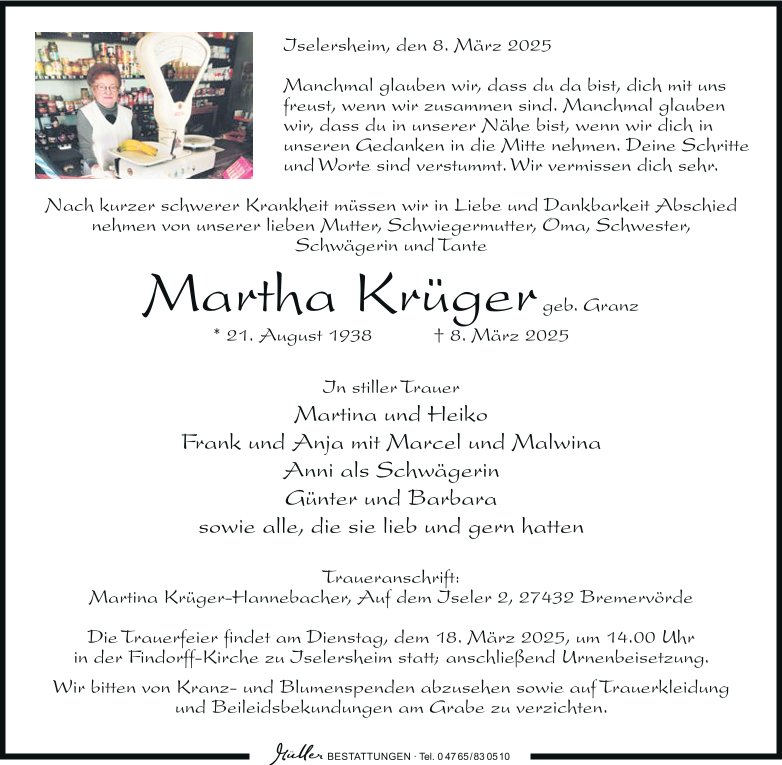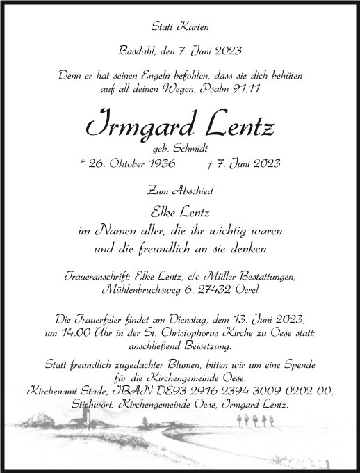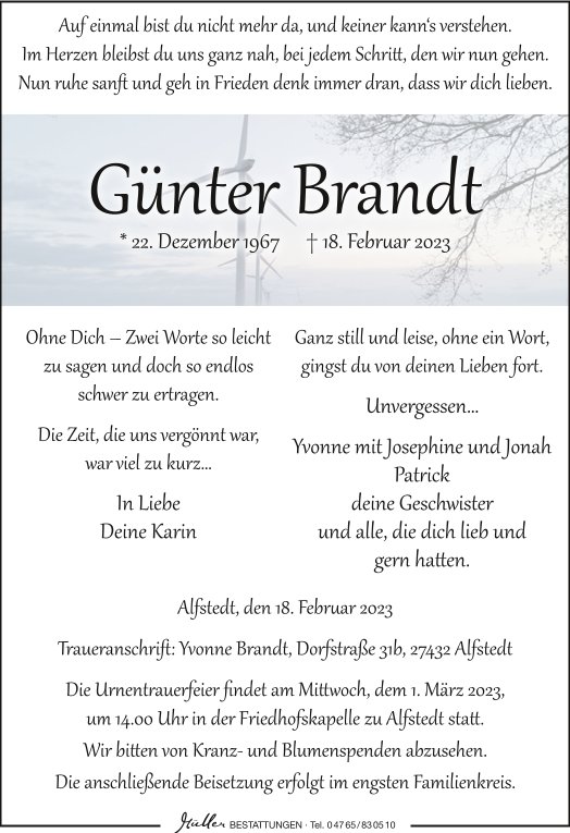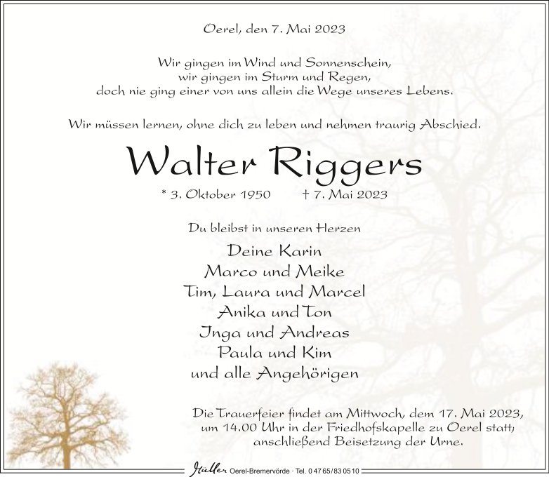 Die Trauerfeier findet am 5. November 2022 um 11.00 Uhr in der Findorff-Kirche zu Iselersheim statt.