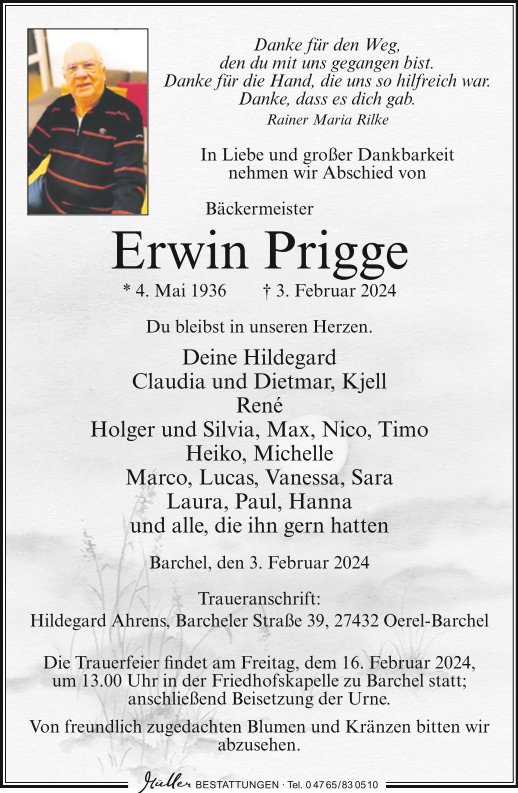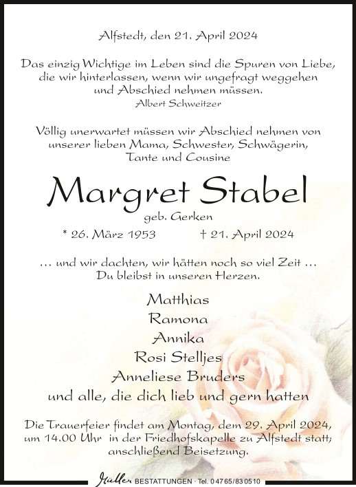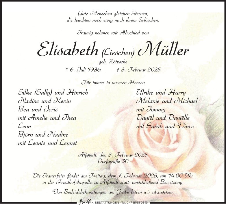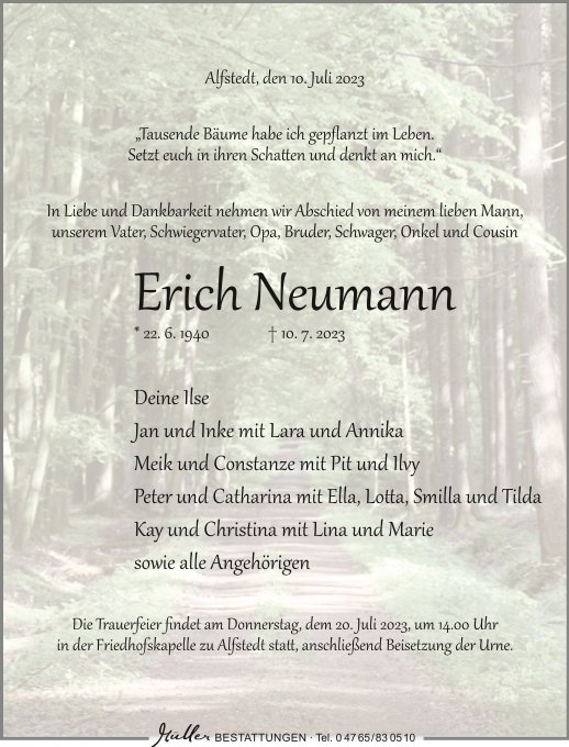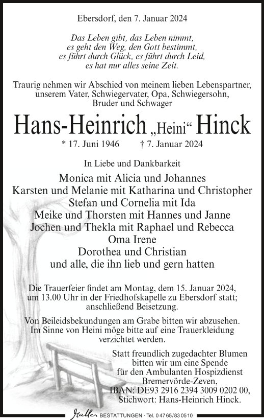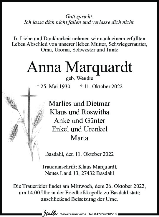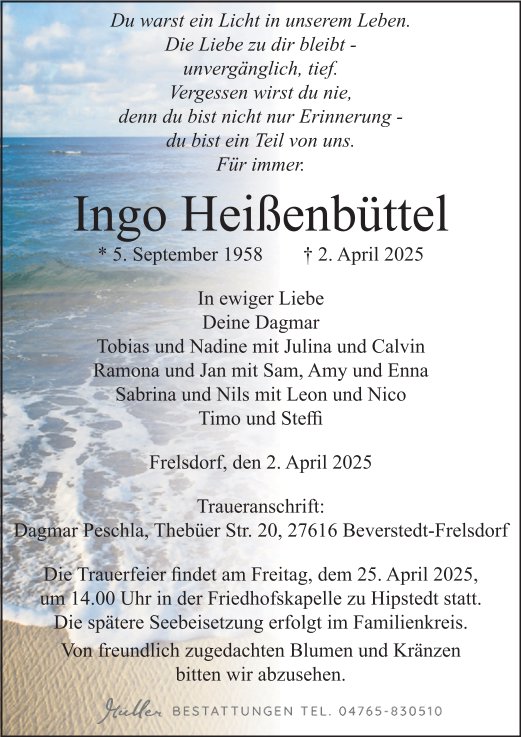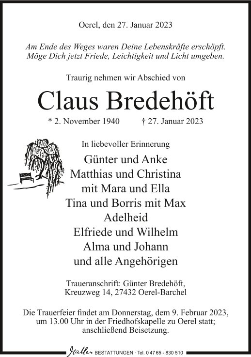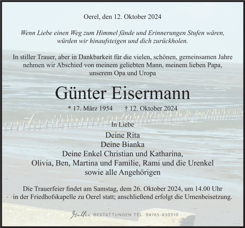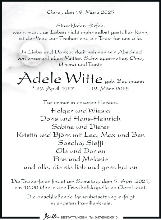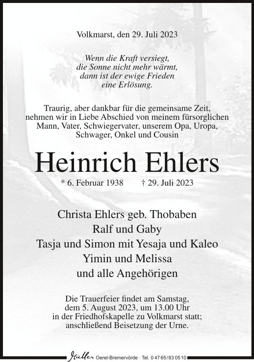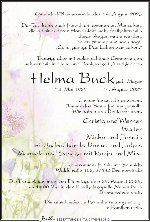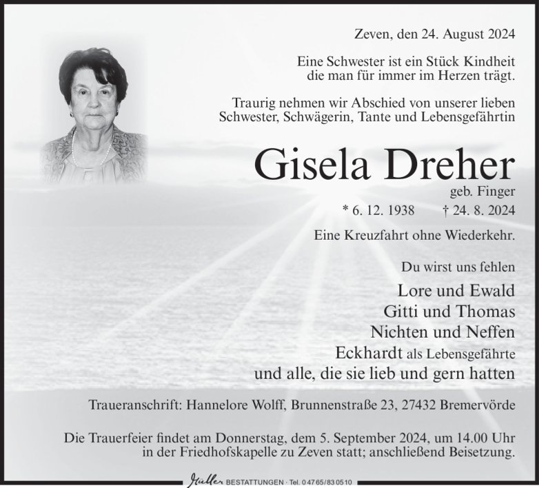 Die Trauerfeier findet am 5. November 2022 um 11.00 Uhr in der Findorff-Kirche zu Iselersheim statt.