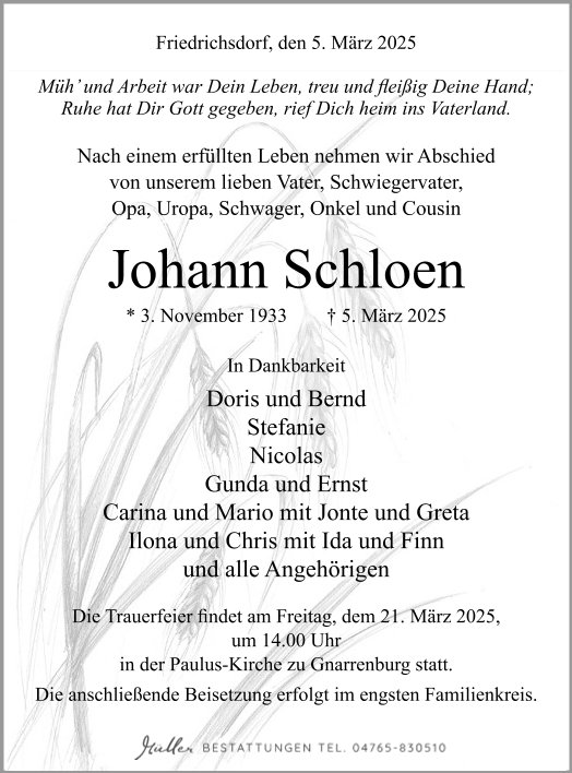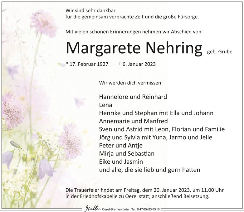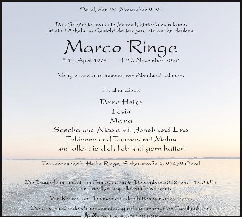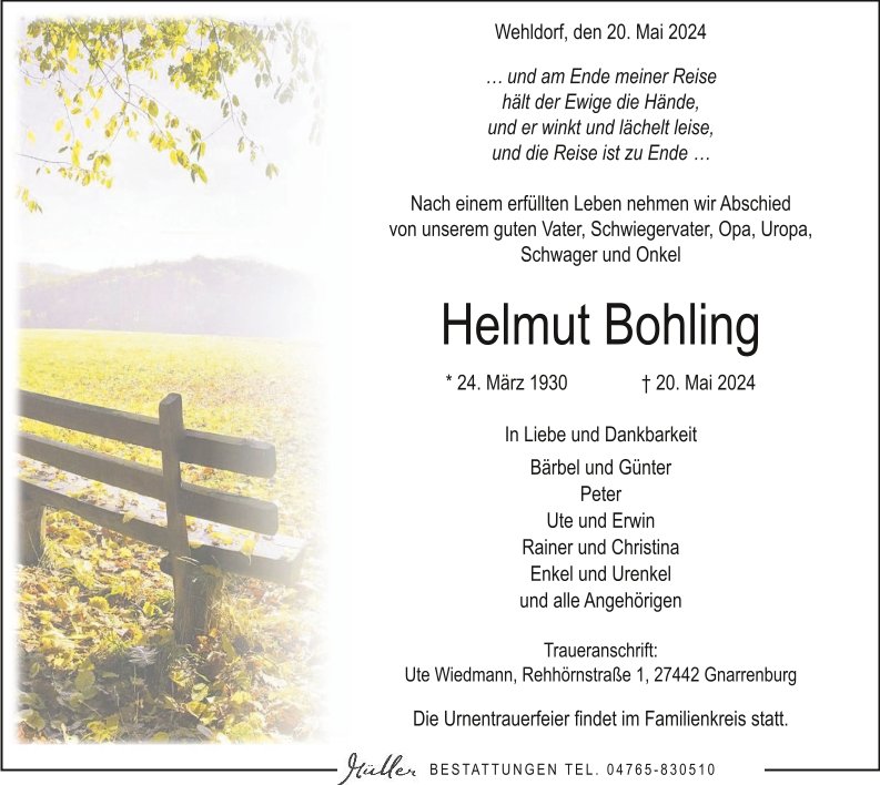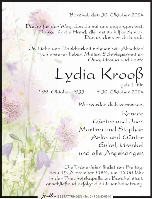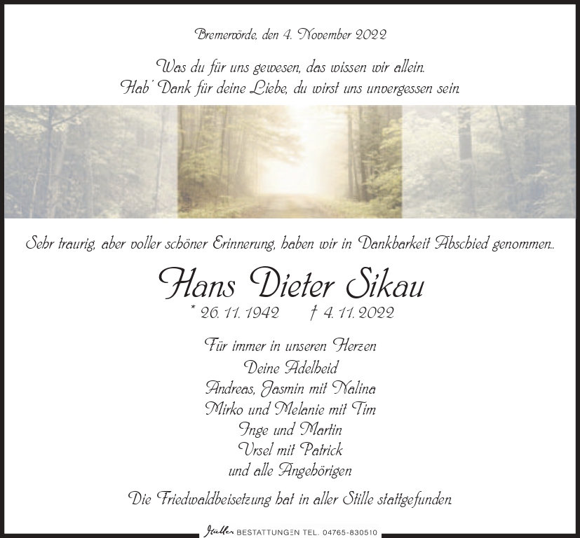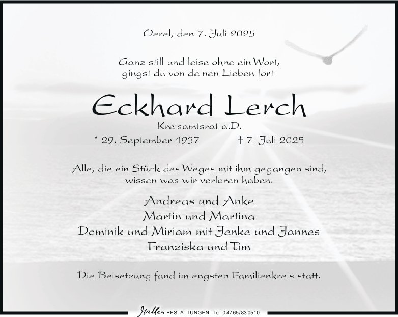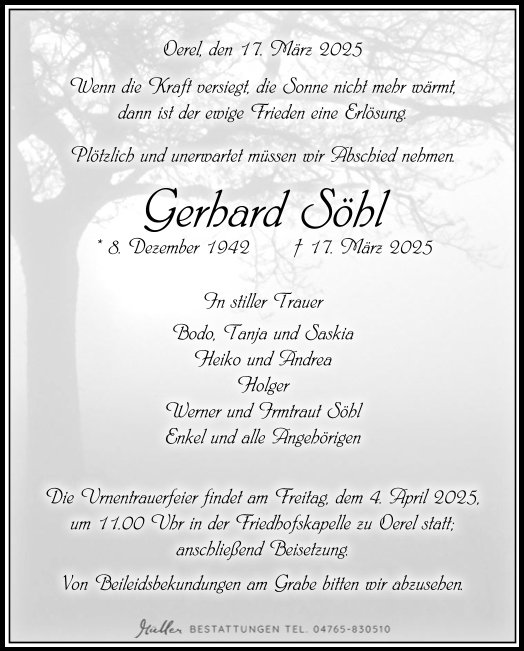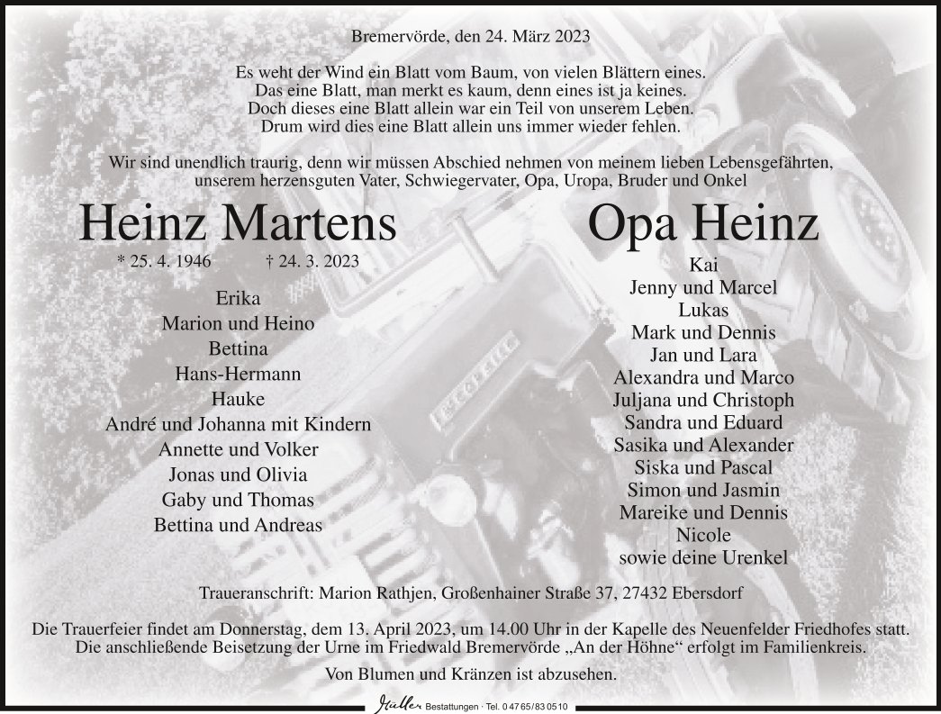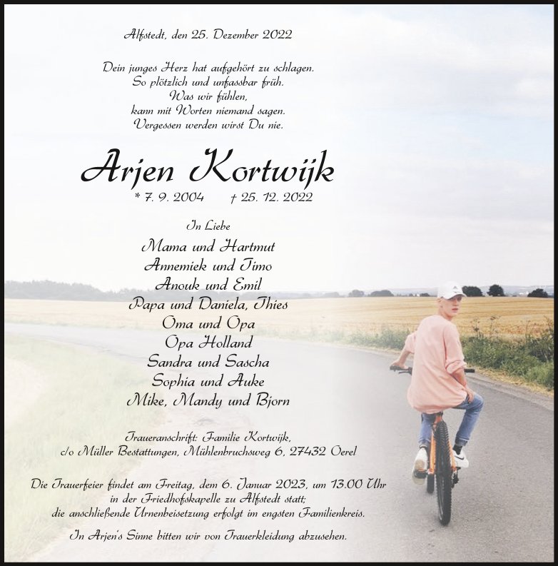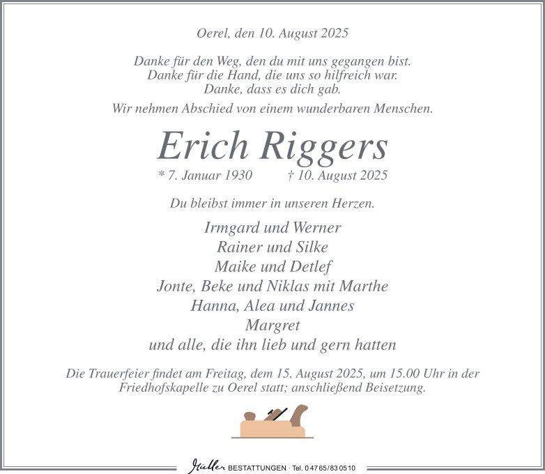 Die Trauerfeier findet am 5. November 2022 um 11.00 Uhr in der Findorff-Kirche zu Iselersheim statt.