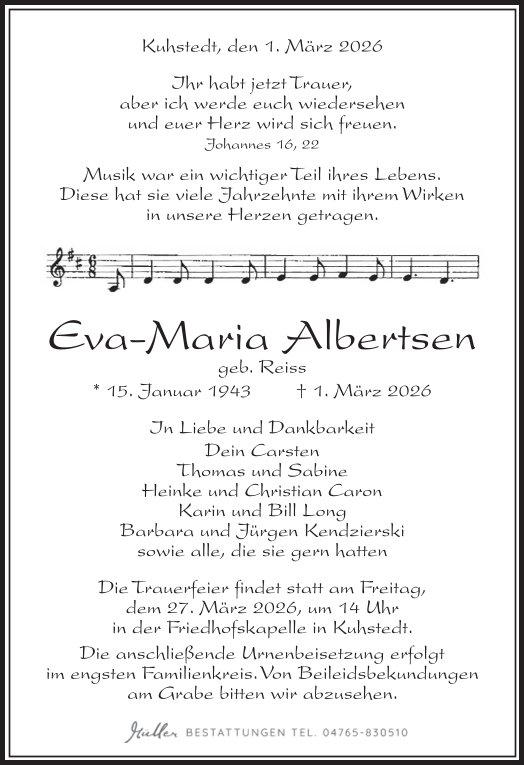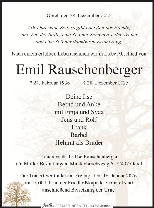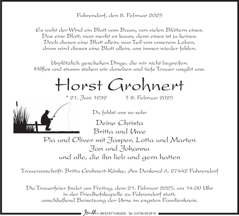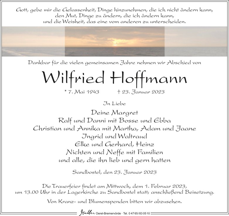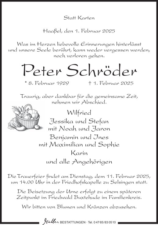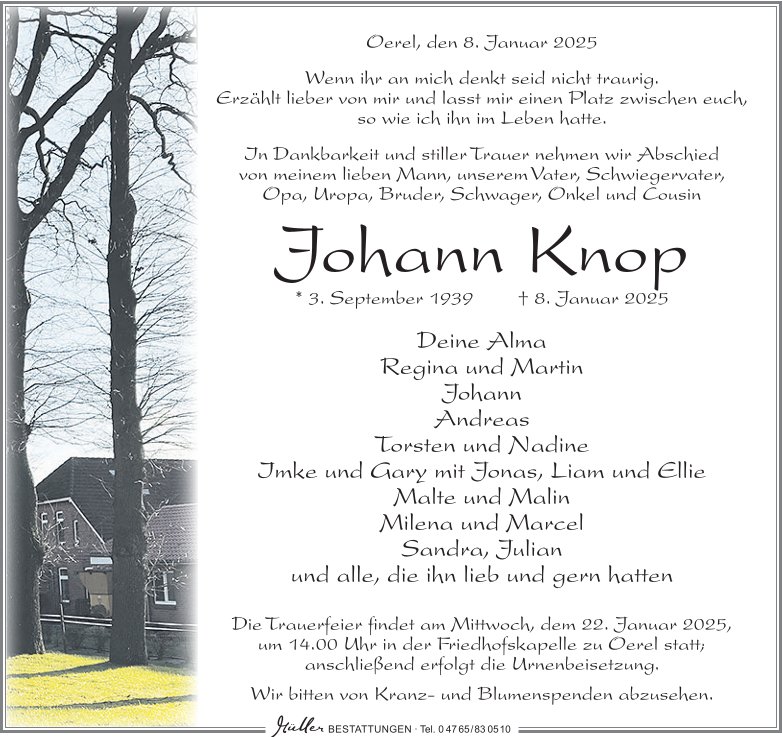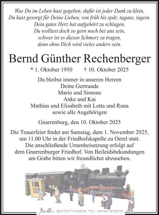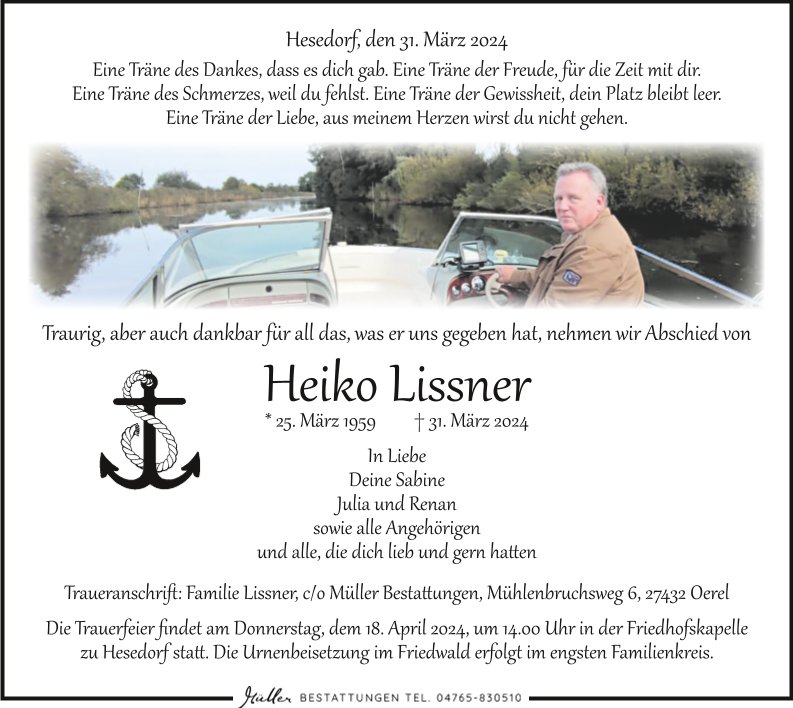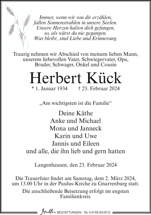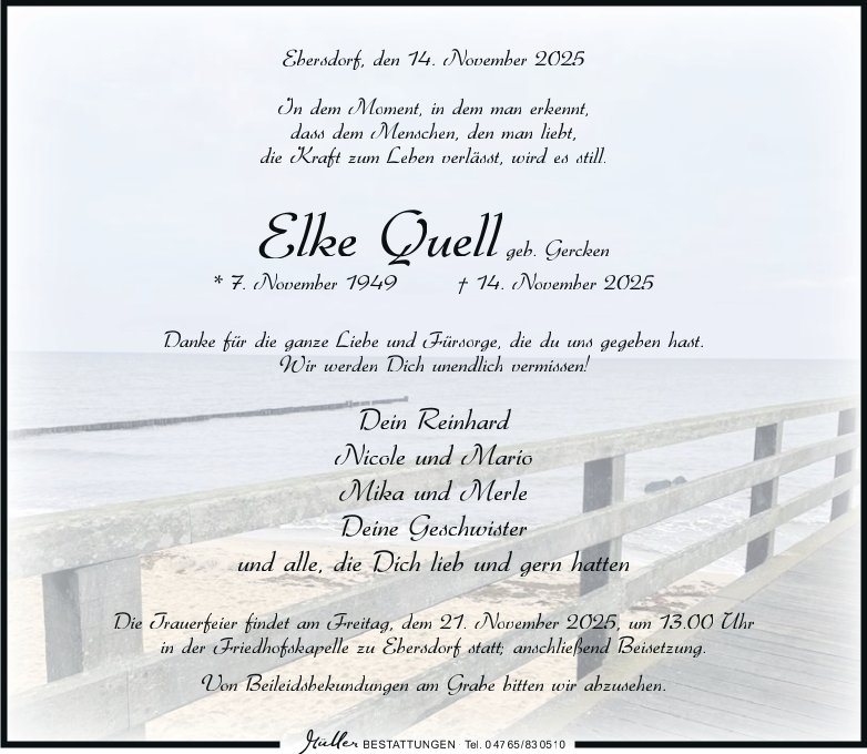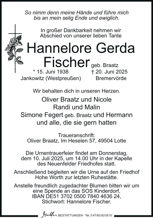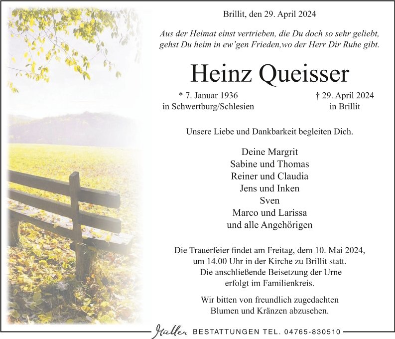 Die Trauerfeier findet am 5. November 2022 um 11.00 Uhr in der Findorff-Kirche zu Iselersheim statt.