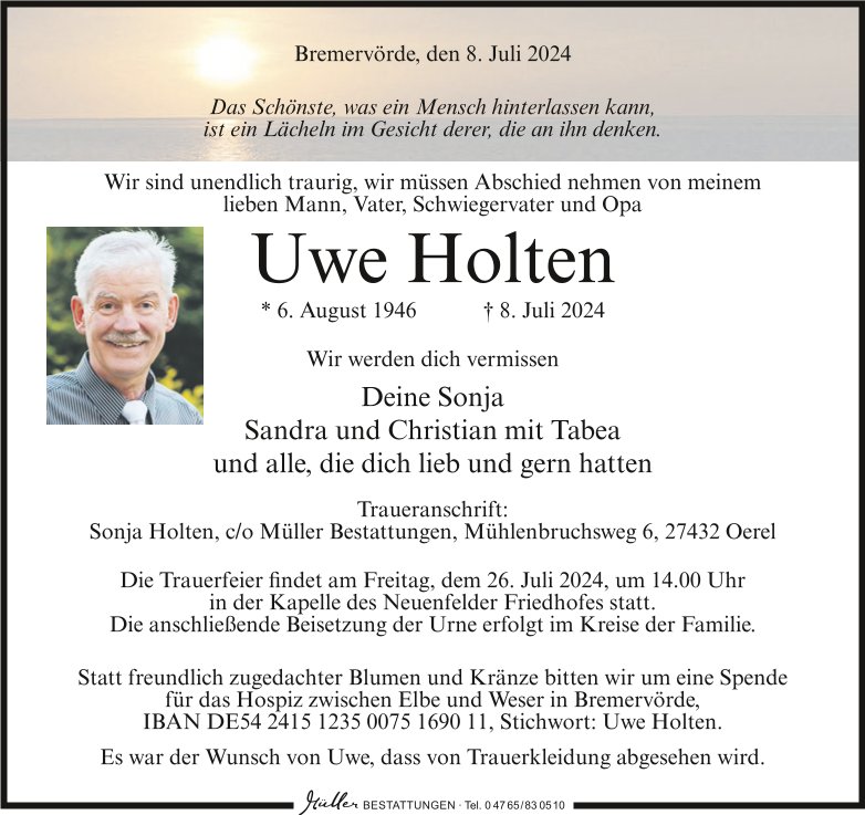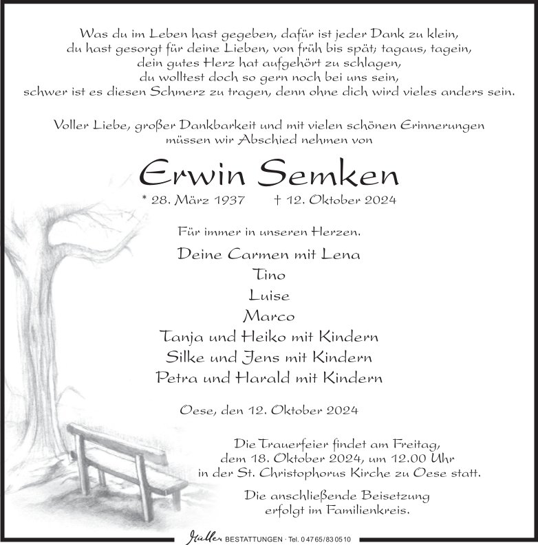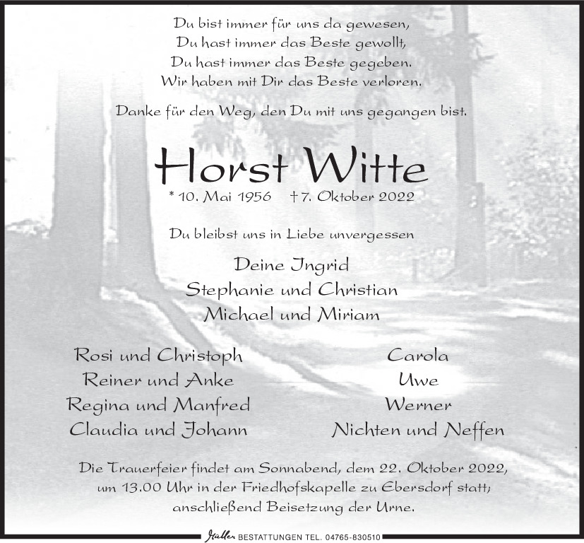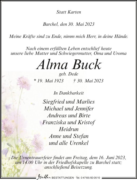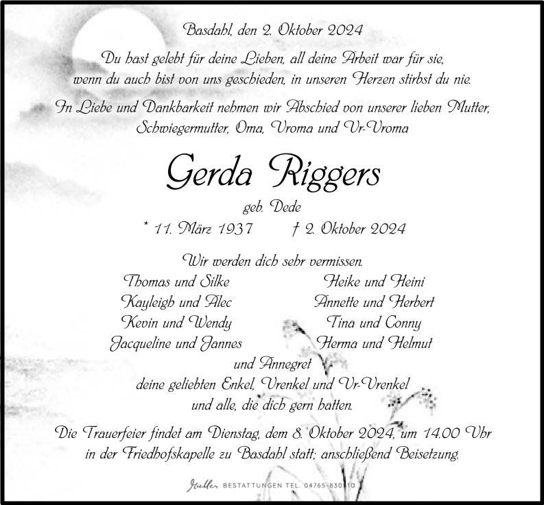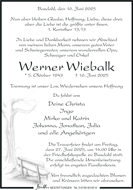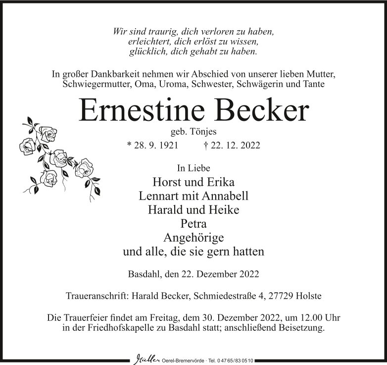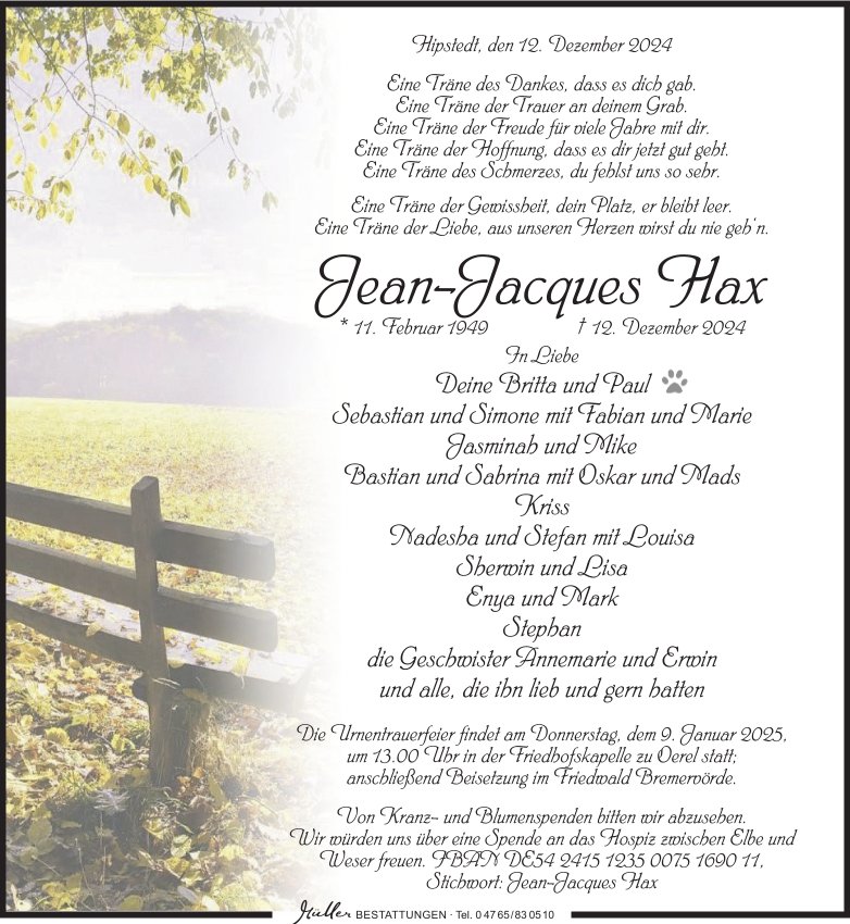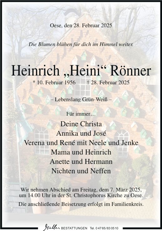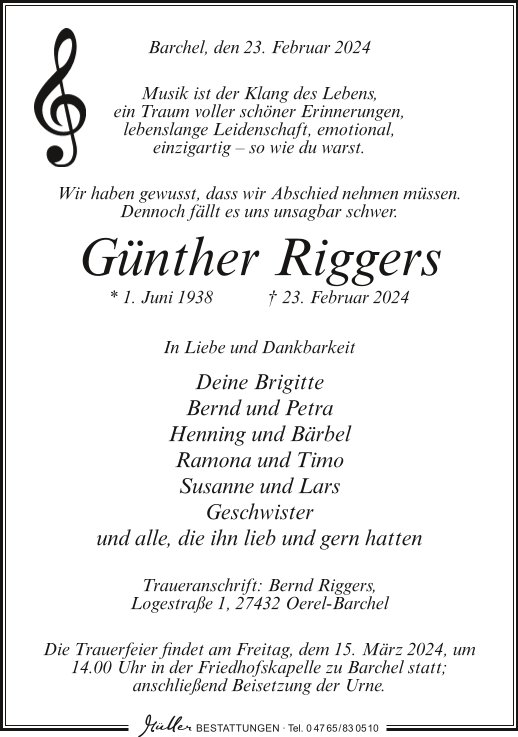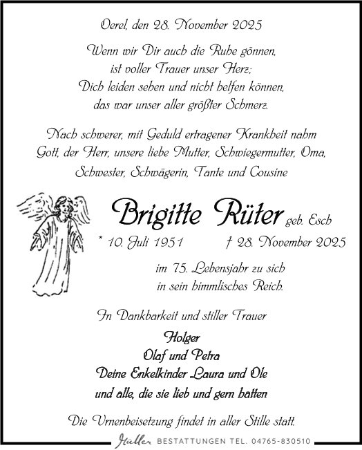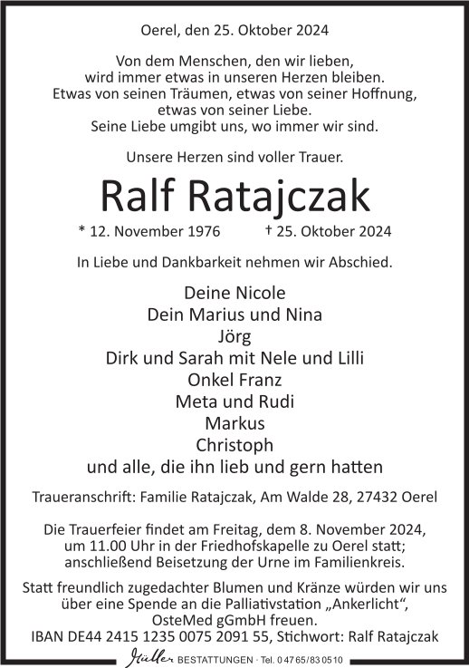 Die Trauerfeier findet am 5. November 2022 um 11.00 Uhr in der Findorff-Kirche zu Iselersheim statt.