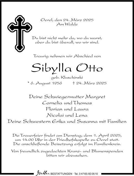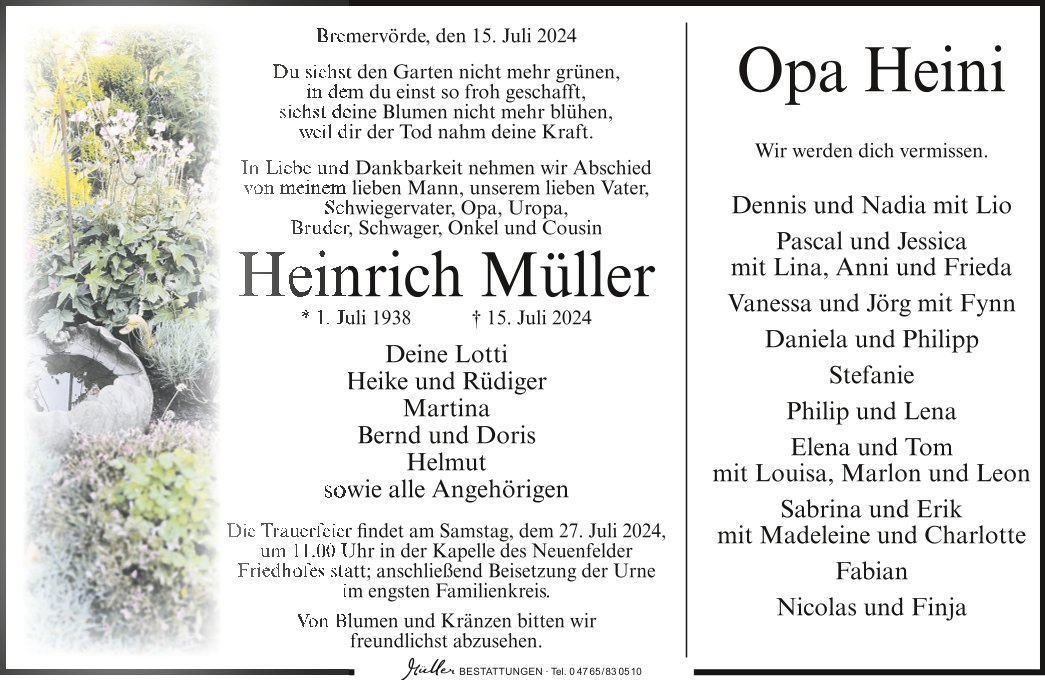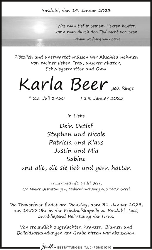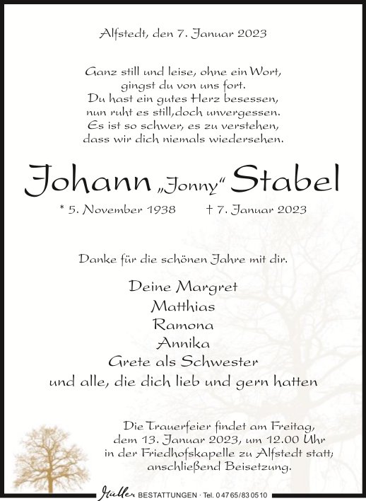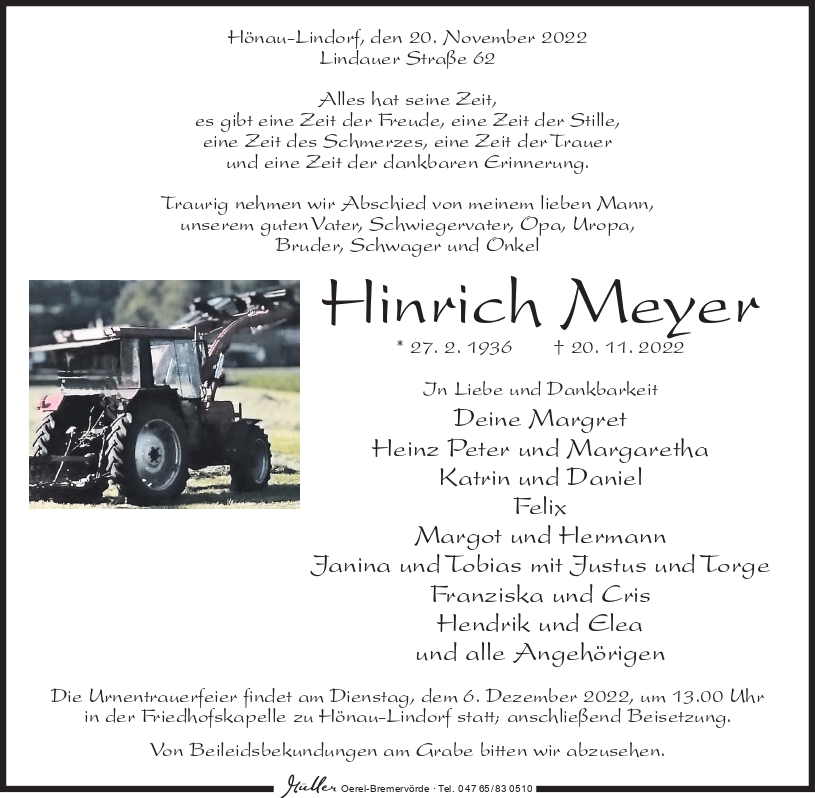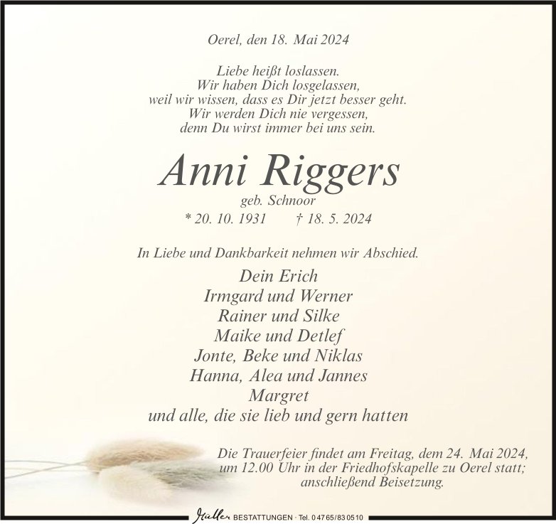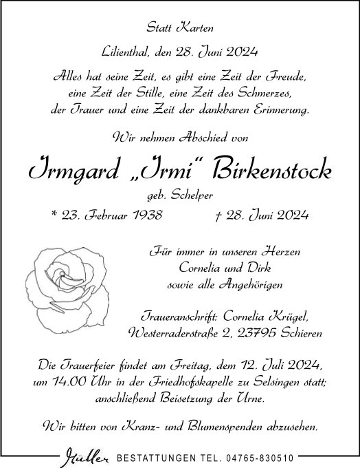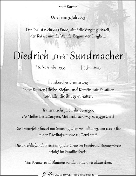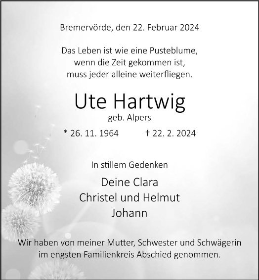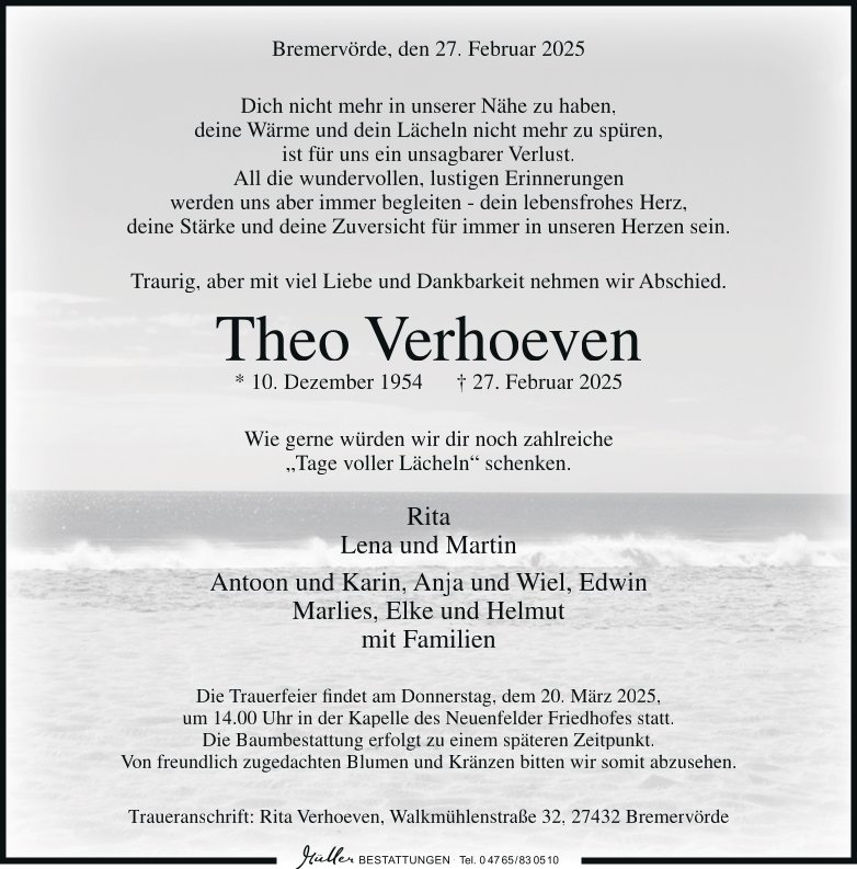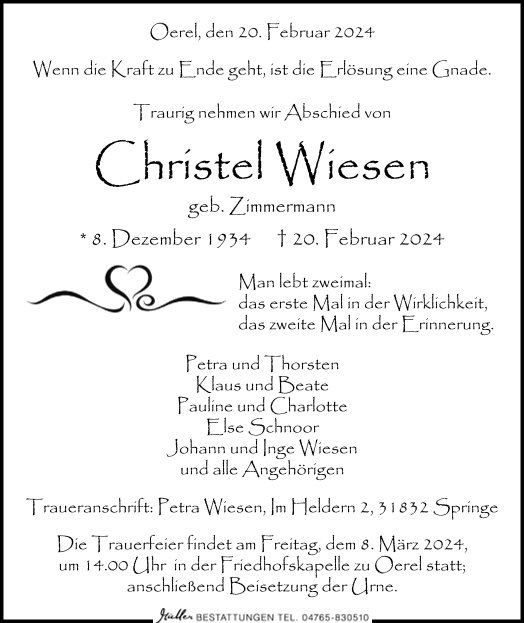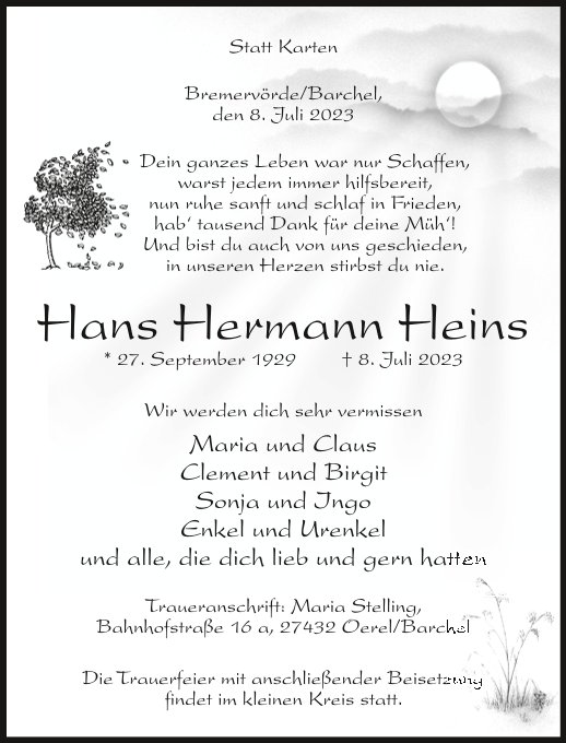 Die Trauerfeier findet am 5. November 2022 um 11.00 Uhr in der Findorff-Kirche zu Iselersheim statt.