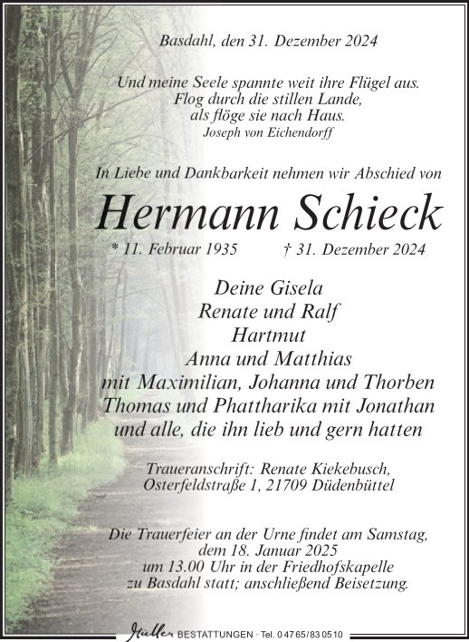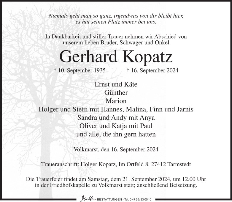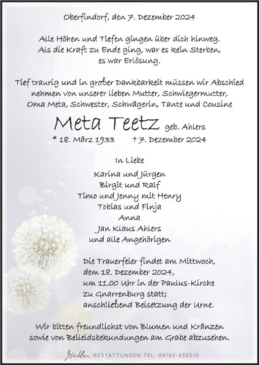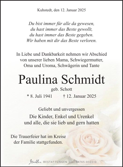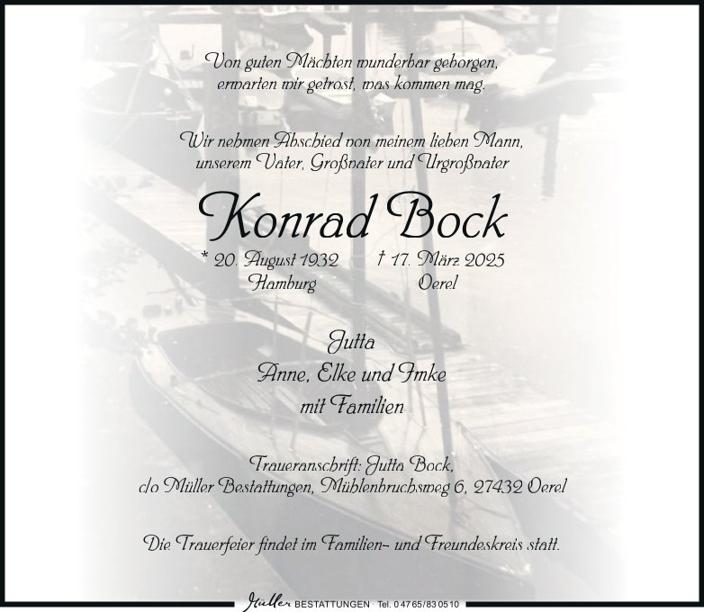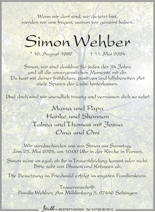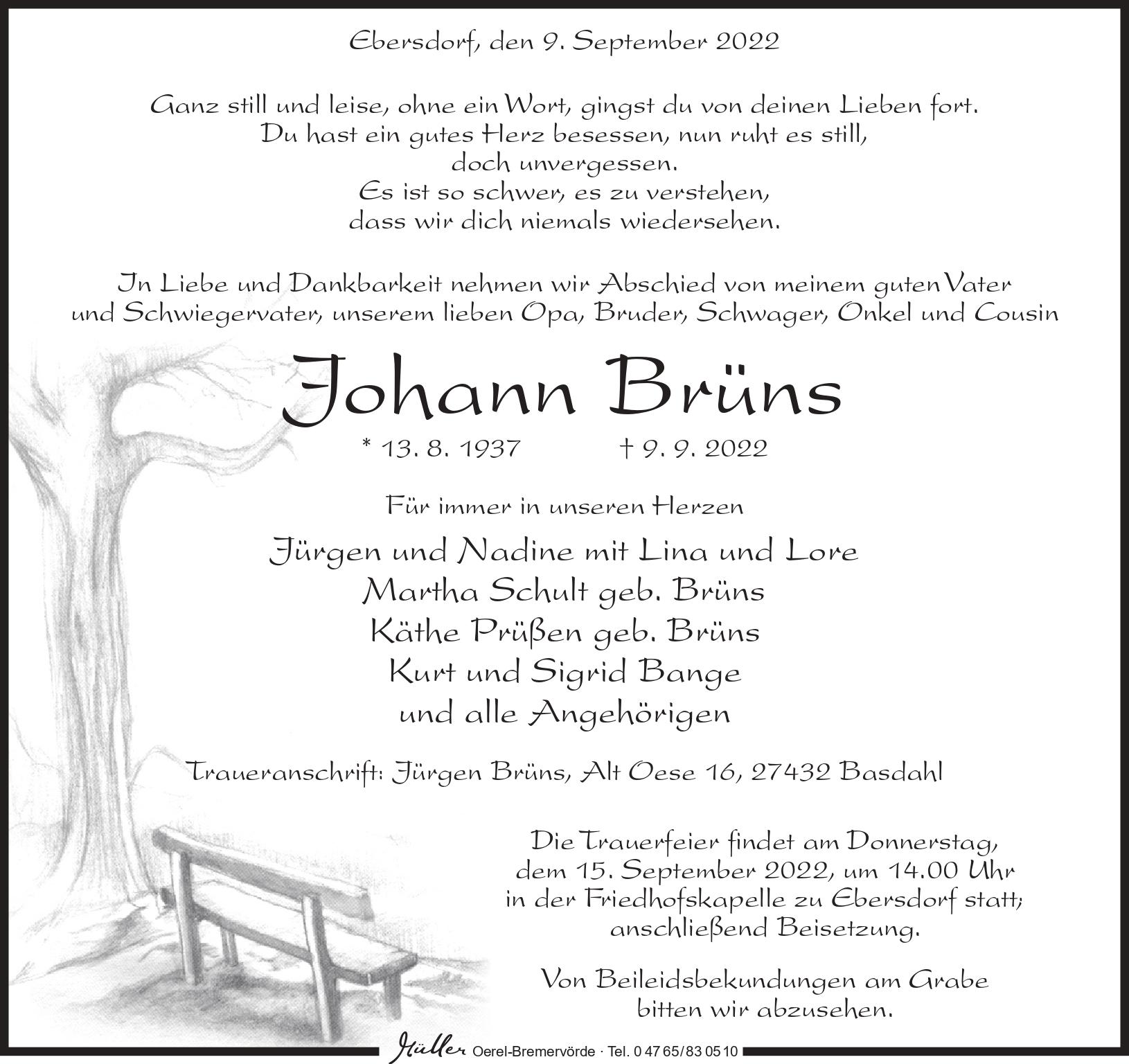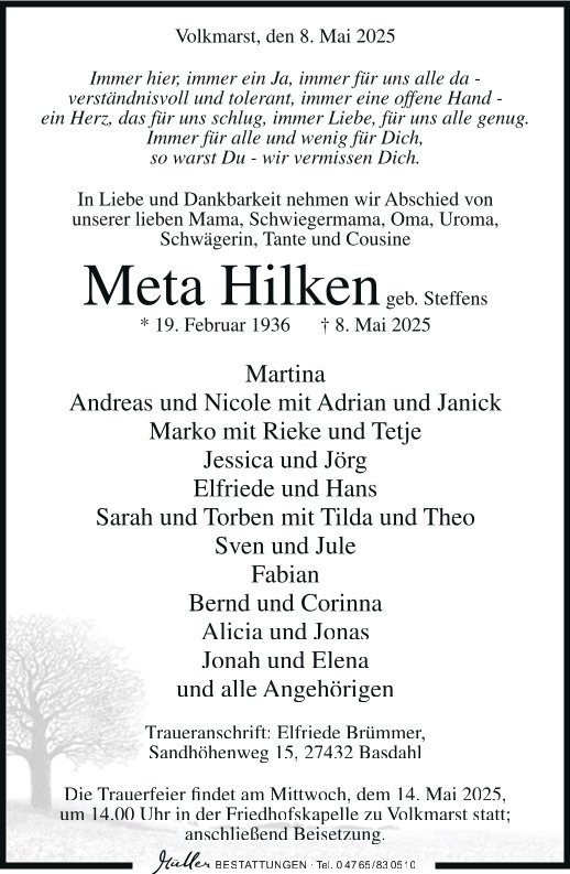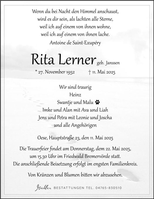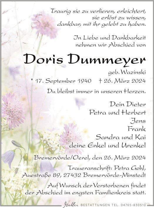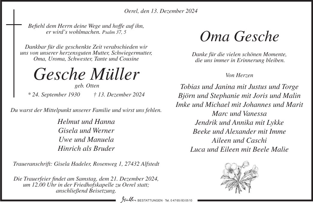 Die Trauerfeier findet am 5. November 2022 um 11.00 Uhr in der Findorff-Kirche zu Iselersheim statt.