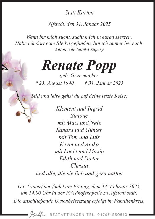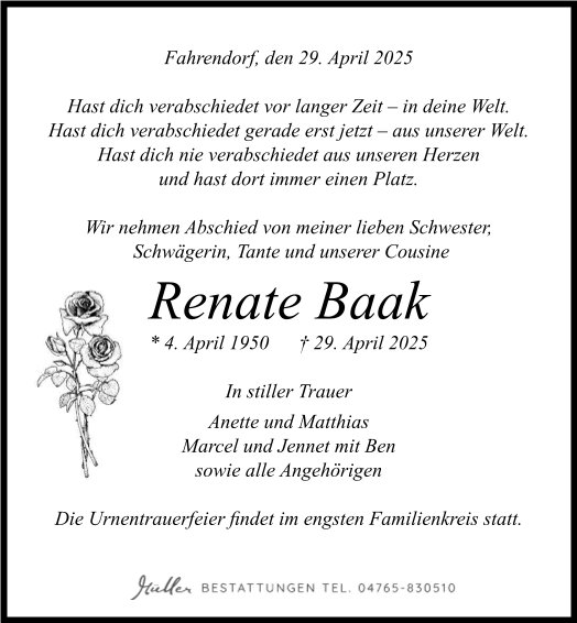 Die anschließende Urnenbeisetzung erfolgt im Familien- und Freundeskreis.